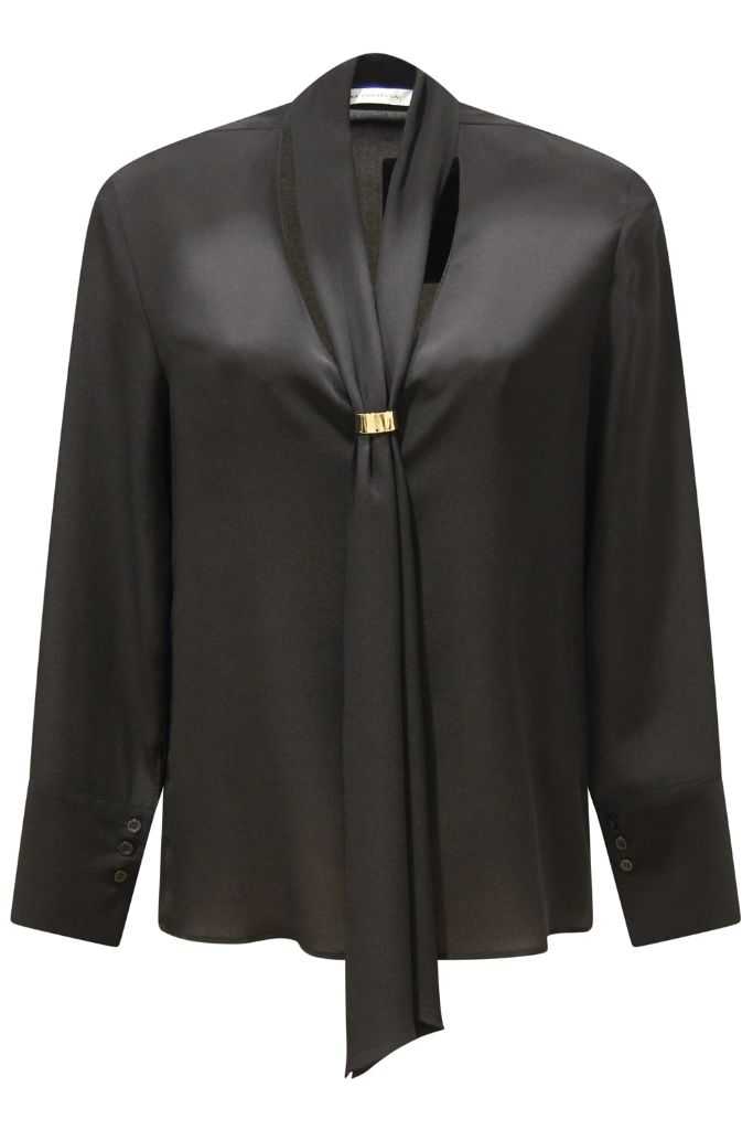 SIMONA CORSELLINI Camicia in seta colore avorio, manica lunga e scollo a v con ''sciarpina'' con anello centrale. 100% SETA