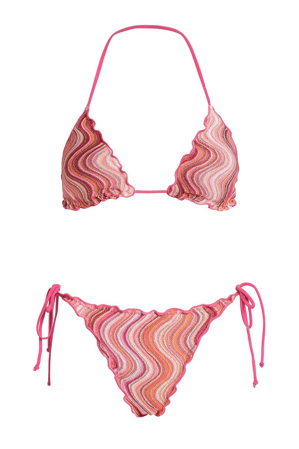 Bikini della linea Fluid è realizzato in lycra e arricchito con un elegante tessuto a maglia crochet, caratterizzato da una fantasia a onde che dona un tocco di originalità. Il top a triangolo offre un sostegno leggero e regolabile grazie ai lacci, ed è dotato di coppe estraibili per una vestibilità personalizzabile. Lo slip, a brasiliana di media copertura, garantisce una silhouette seducente e confortevole, con lacci regolabili sui fianchi per un fit perfetto. Questo bikini è la scelta ideale per chi cerca uno stile sofisticato e versatile per le giornate al sole.