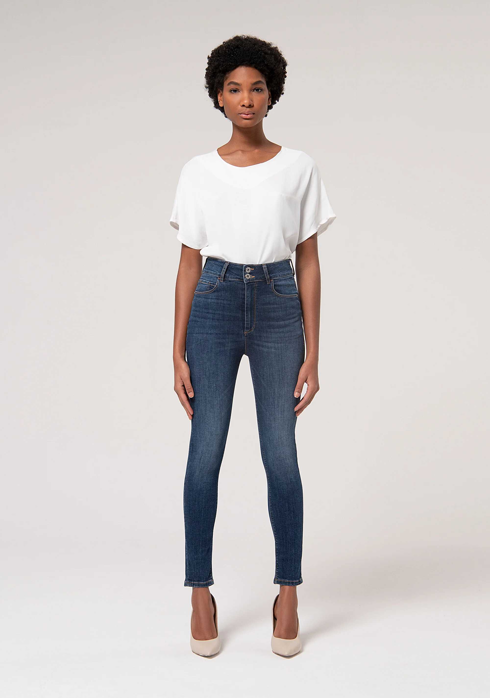 Jeans slim in denim stretch con lavaggio medio, vita alta, 5 tasche, e con fondo stretto.