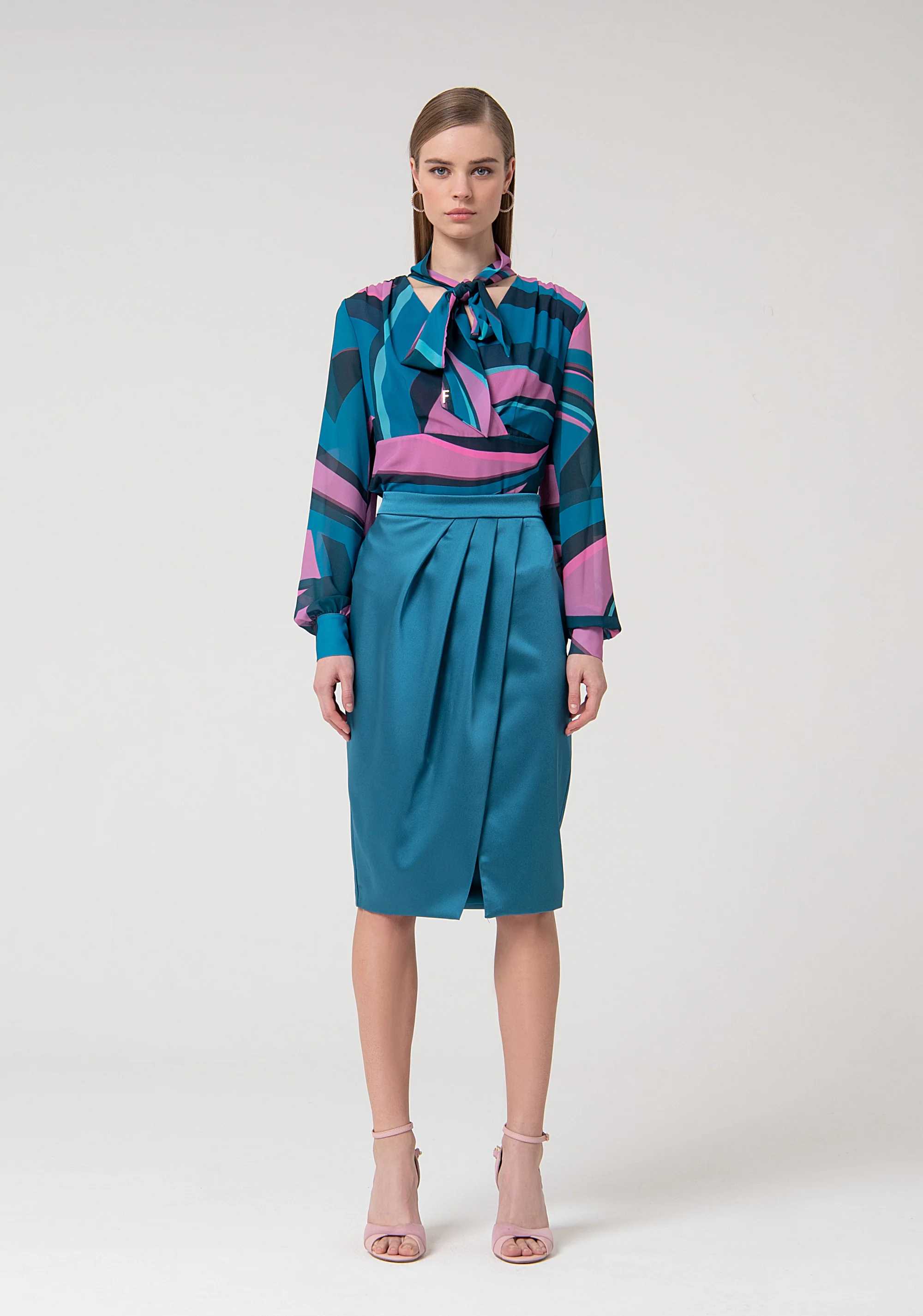 Gonna regular midi in raso, vita alta, arriccio laterale, e con spacco sul davanti laterale.