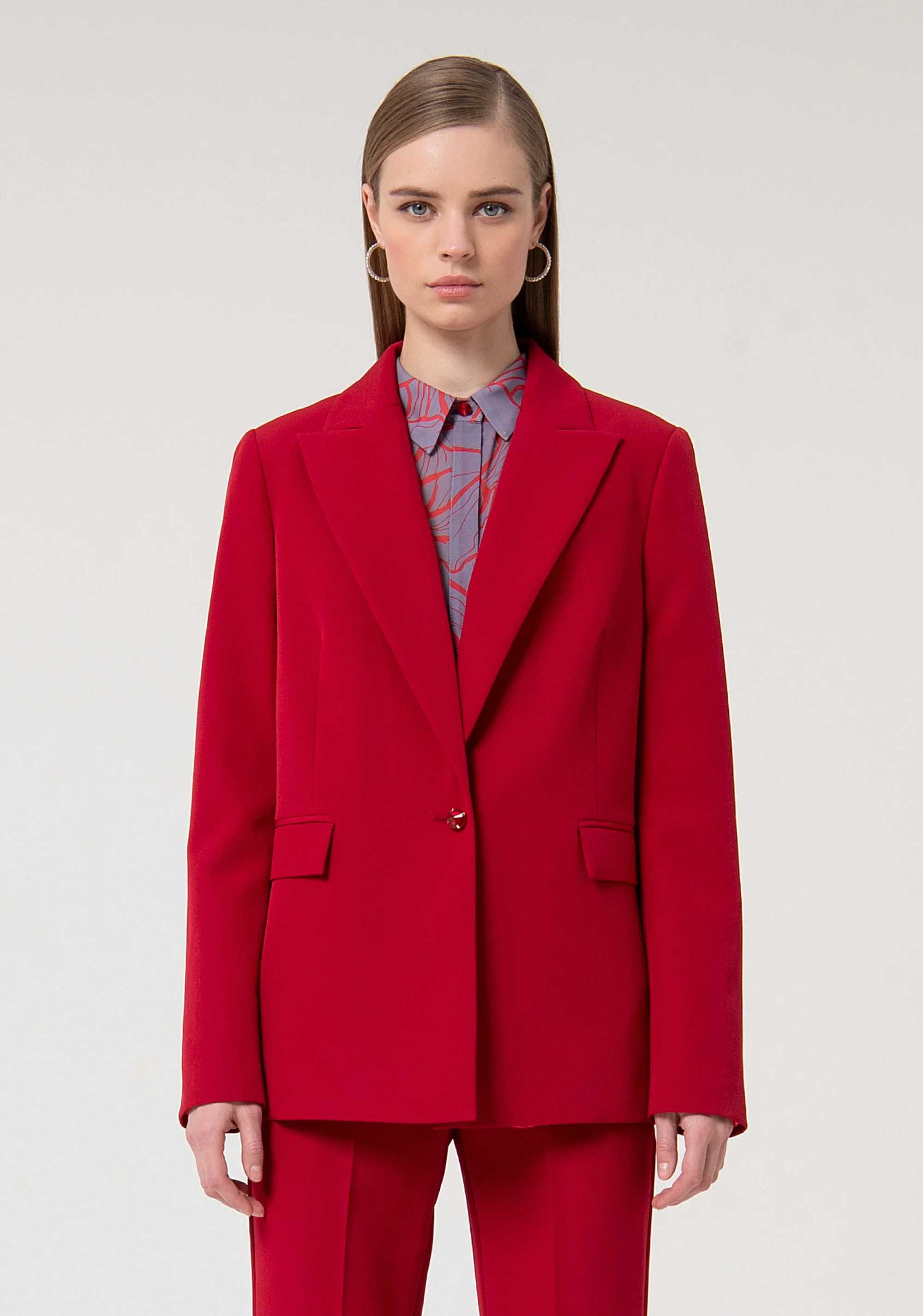 Blazer regular monopetto in tessuto stretch, revers a lancia, bottoni gioiello, tasche applicate, e con maniche lunghe.