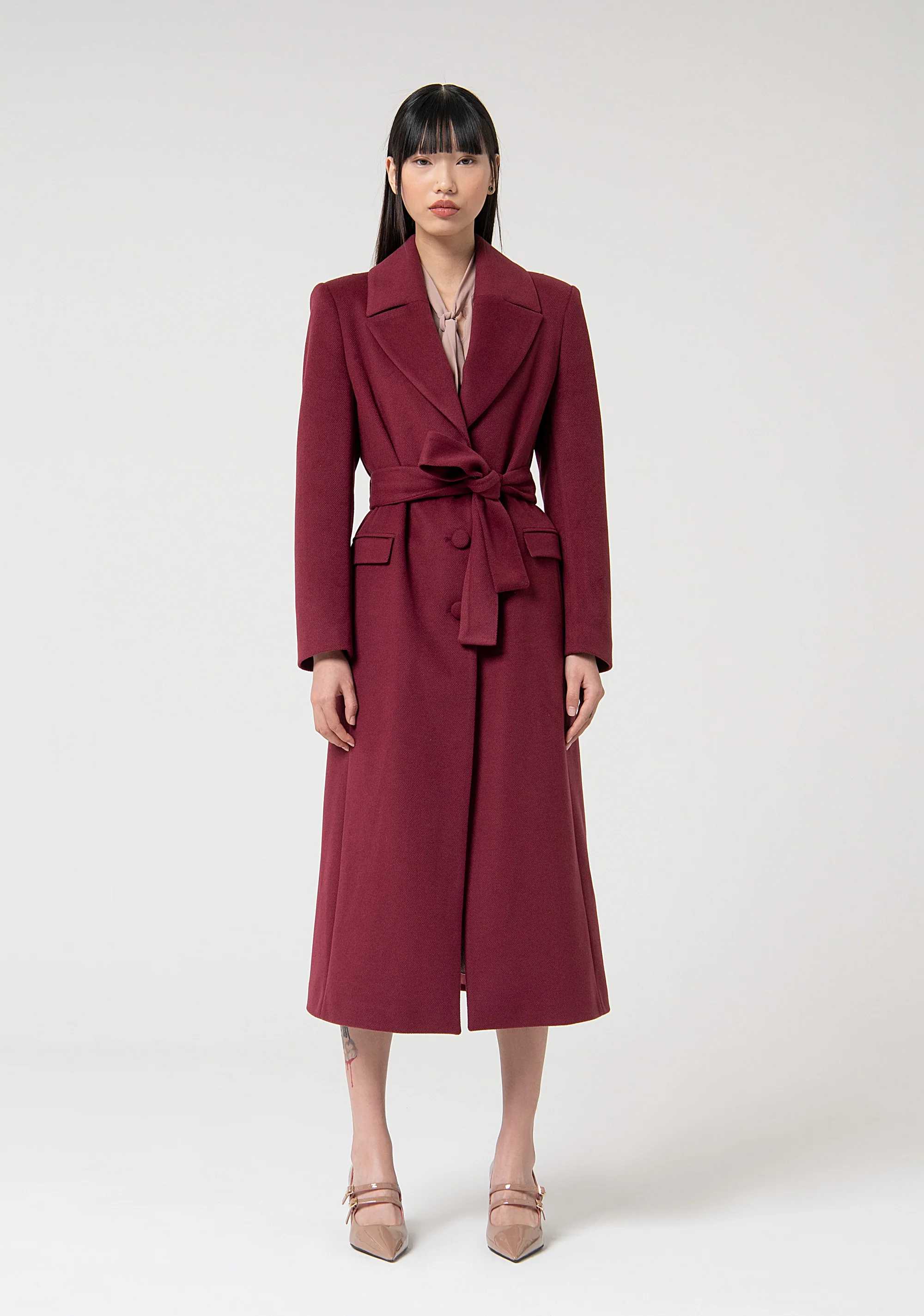 Cappotto regular lungo monopetto, revers classcio, fusciacca in vita, tasche con pattina laterali, e con maniche lunghe.