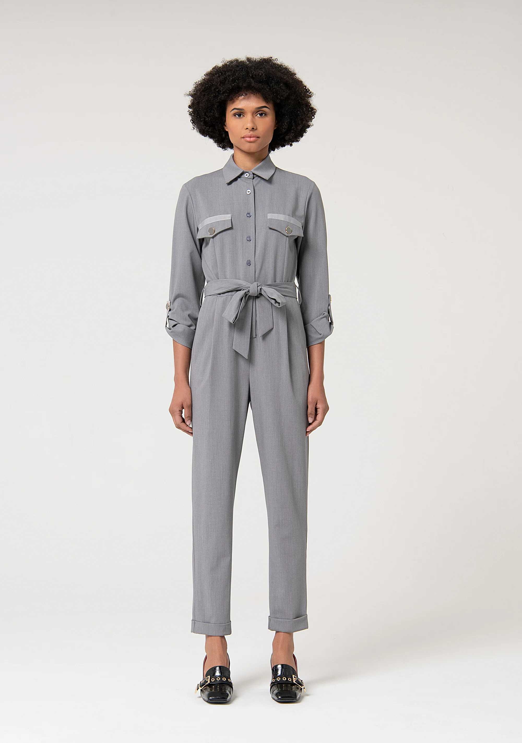 Tuta regular lunga con tasconi, colletto classico, bottoni centrali per apertura, maniche lunghe, e con pantalone con pences con fondo dritto.
