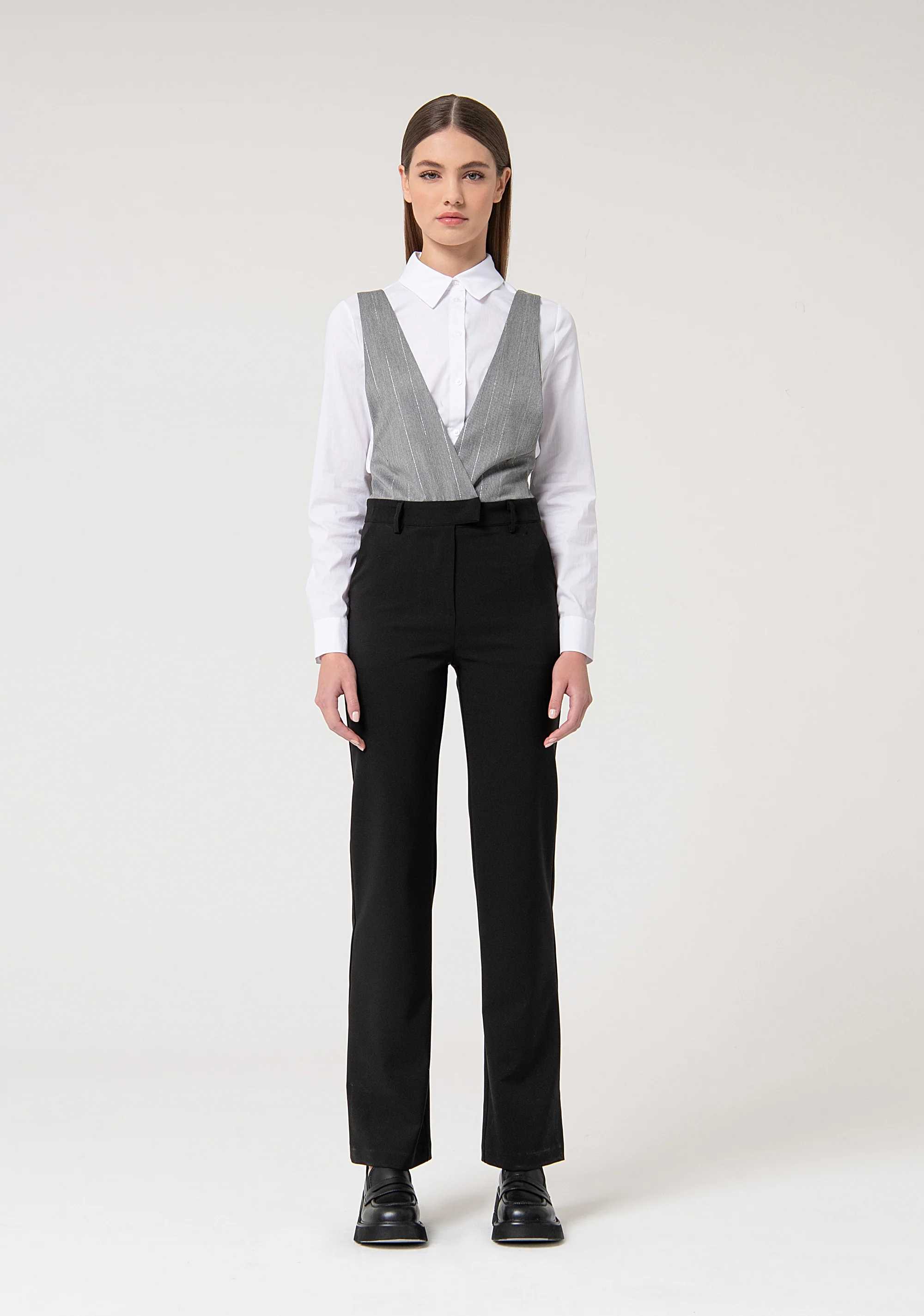 Tuta senza maniche lunga, top con scollo ad incrocio in tessuto gessato, e con pantalone modello chino con tasche alla francese sul davanti.