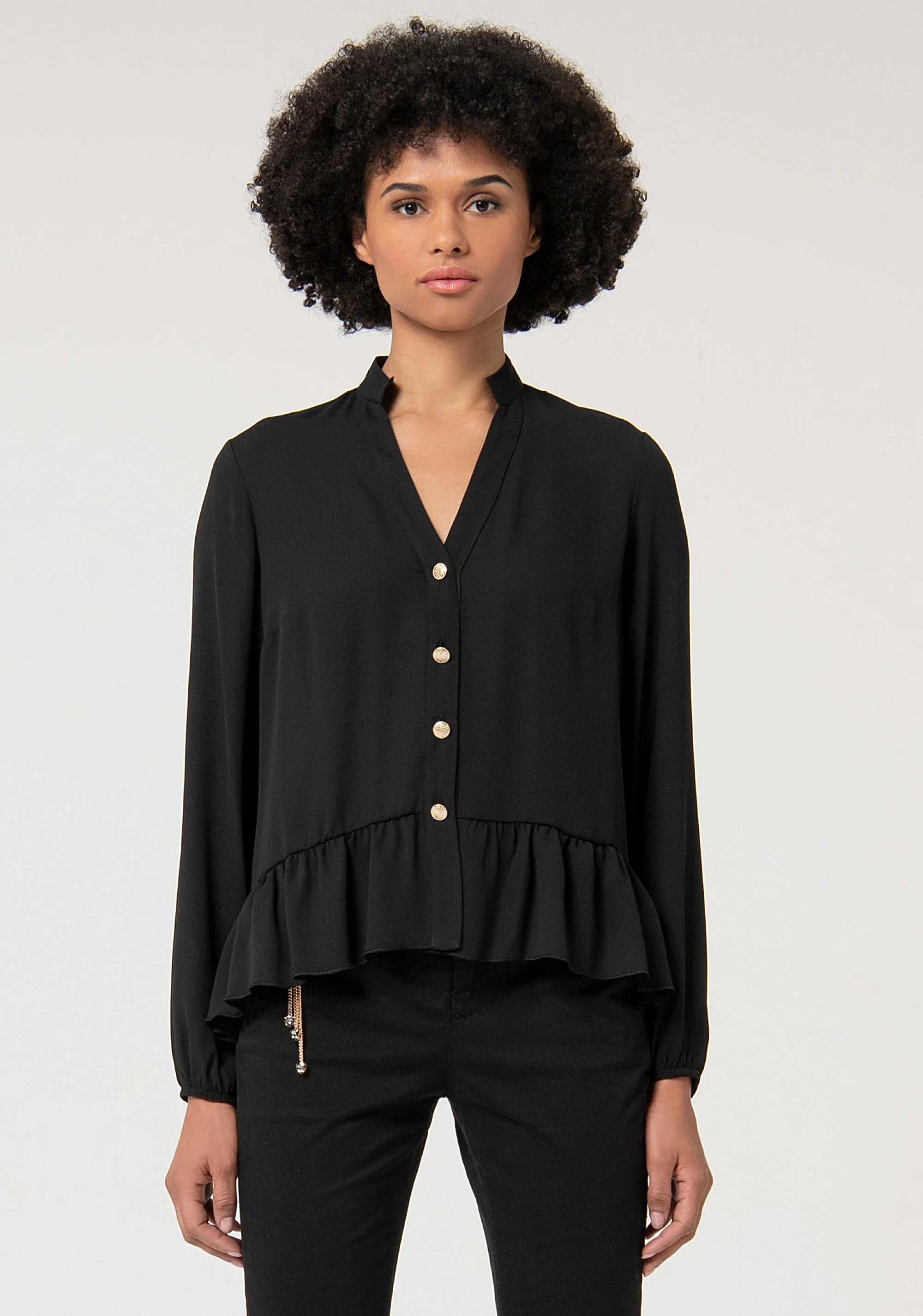 Blusa linea ad A in crepè, scollo a V, bottoni centrali per apertura, balza sul fondo, e con maniche lunghe.