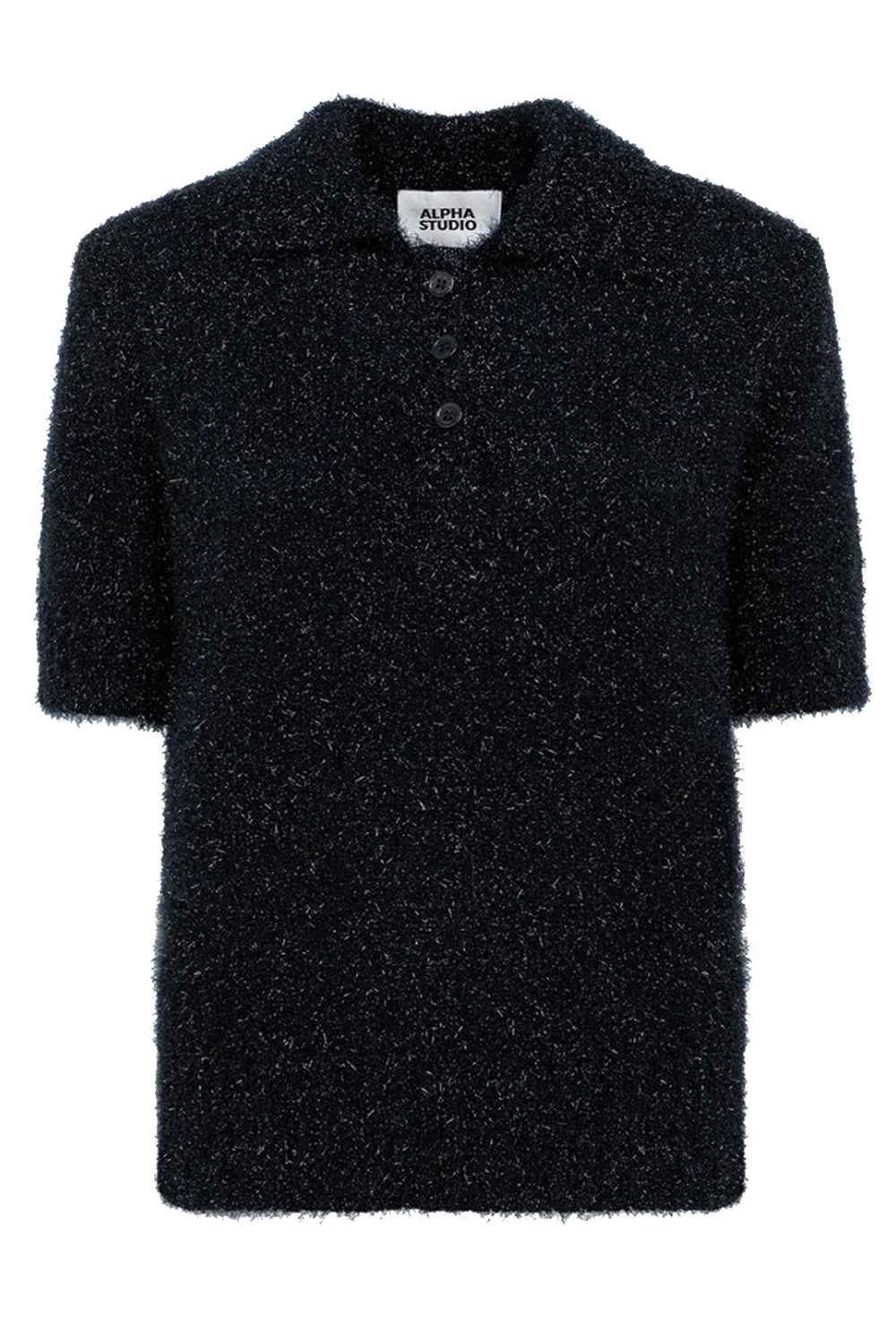 ALPHA STUDIO Polo mezza manica in filato lurex colore blu notte La modella è alta 180 cm e indossa la taglia 42 COMPOSIZIONE: 55% VISCOSA 45% POLIAMMIDE.