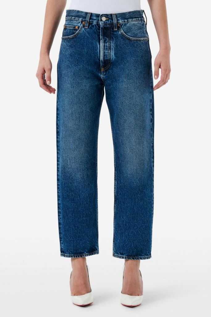 CYCLE Jeans straight fit con vita medio-bassa. Caratterizzato da una vestibilità mom fit, che richiama lo stile inconfondibile degli anni novanta, questo modello cinque tasche presenta una gamba dritta cropped e una tela rigida tipica dei denim più autentici. Per questo capo dall'inconfondibile tonalità navy blue, il brand propone un lavaggio stone wash con spazzolatura che crea sul tessuto un effetto vissuto, soprattutto in corrispondenza delle zone d'usura. Il tocco distintivo è rappresentato dall’incrocio di passanti sul retro che richiama il logo e, sulla tasca posteriore, dall’inconfondibile logo placcato, espressione del DNA di Cycle.