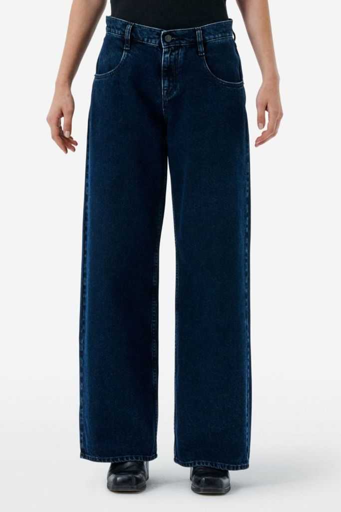 CYCLE Jeans Aida Low wide leg colore blu scuro Jeans con vita bassa. Il modello a quattro tasche, gamba molto ampia e dritta con cavallo sceso. Per questo capo il tessuto, un denim rigido di puro cotone, si colora di un'intensa tonalità deep blue con sovratintura nera e lavaggio enzimatico stone wash eco-friendly che crea un effetto vissuto lungo i bordi e che conferma l'impegno di Cycle per la sostenibilità. L'impronta distintiva del brand è ben riconoscibile anche nei dettagli sul retro, dai passanti incrociati che formano il logo Cycle al piccolo elemento placcato che richiama ancora una volta il logo.