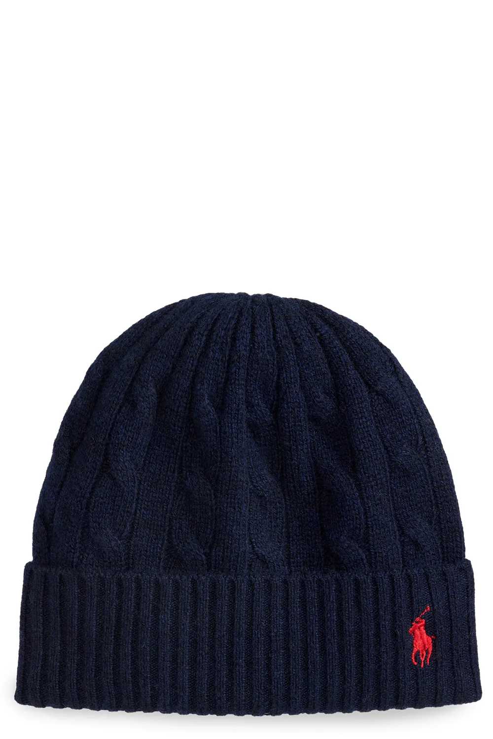 POLO RALPH LAUREN Cappello in lana e cashmere a trecce colore blu con iconcio pony ricaamto lateralmente 90% lana 10% cashmere