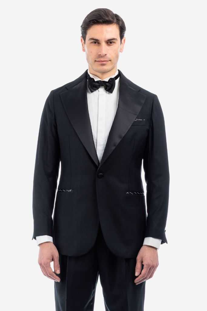 -abito smoking -tessuto esclusivo holland&sherry -mohair -trama galles tono su tono -petto sartiale in raso 12 cm -mezza foderata interna -spalla napoli -tasca a friso -bottone ricoperto -drop 7 regolare -pantalone modello gigi -bustino 6cm -tiranti laterali -2 pinces -vestibilita' comoda