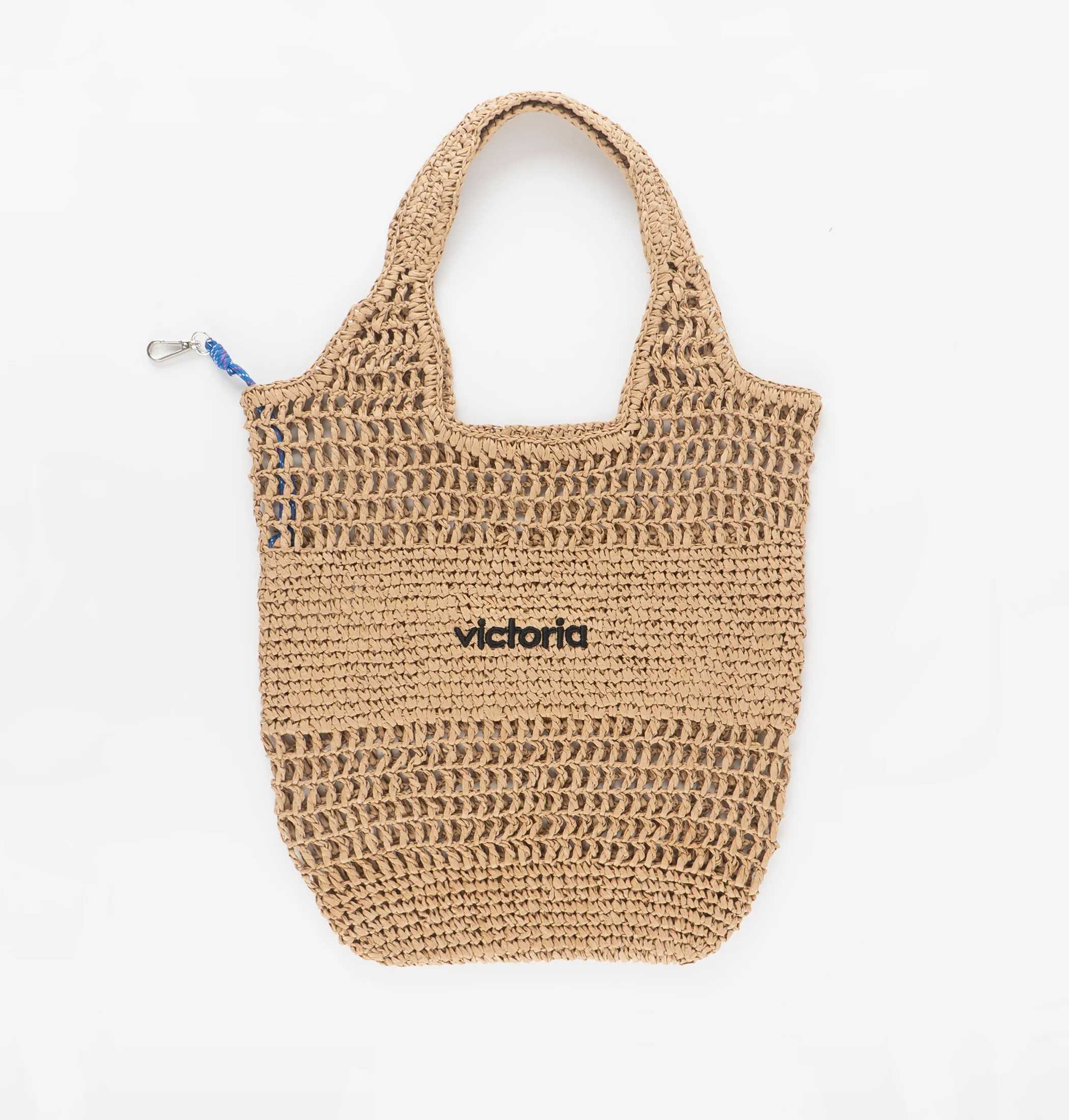 Borsa in tessuto di fibra naturale. Include un cordino interno per agganciare il nostro portafoglio o necessaire. Dettaglio ricamato di Victoria a contrasto. Può presentare piccole variazioni di colore, misura, texture e forma essendo tessuta in modo artigianale. Misure generali: 37 x 38 x 1 cm
