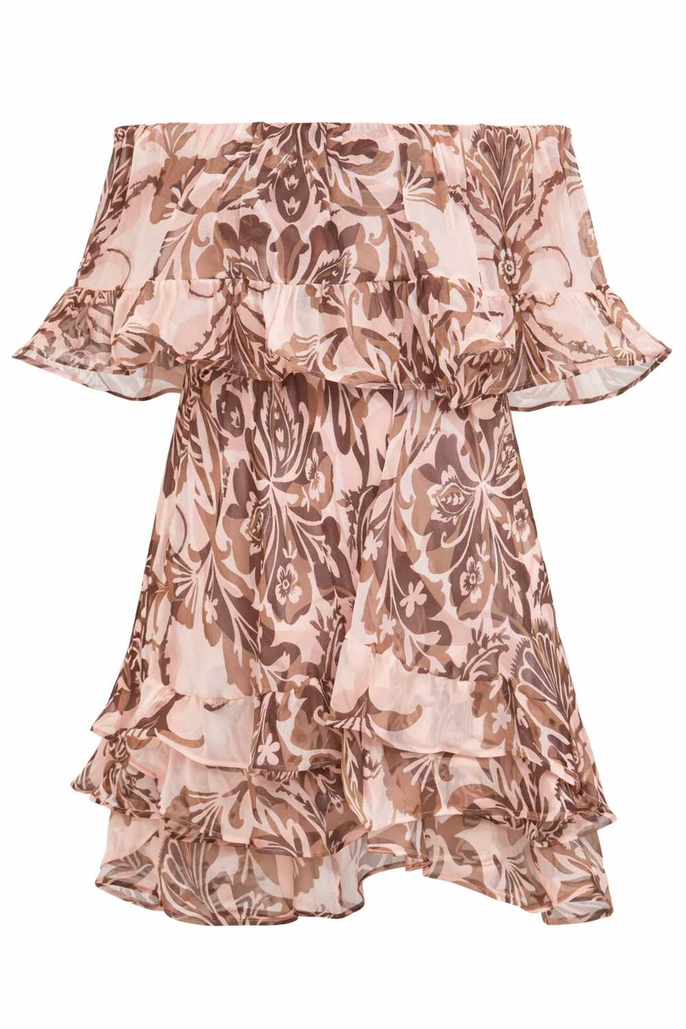 SIMONA CORSELLINI Abito in creponne stampa decor, scollo dritto con parte delle spalle elasticizzata. Fondo a ruota.
