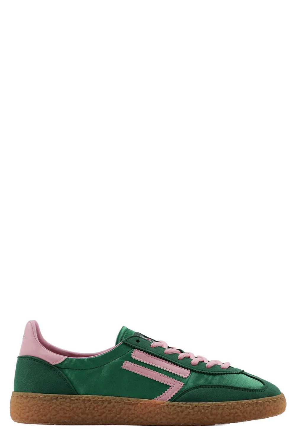 PURAAI Scarpe da ginnastica modello XS ecocompatibili e non testate sugli animali, realizzate con materiali riciclati e organici in verde con dettagli rosa. suola color vaniglia con lacci in cotone rosa