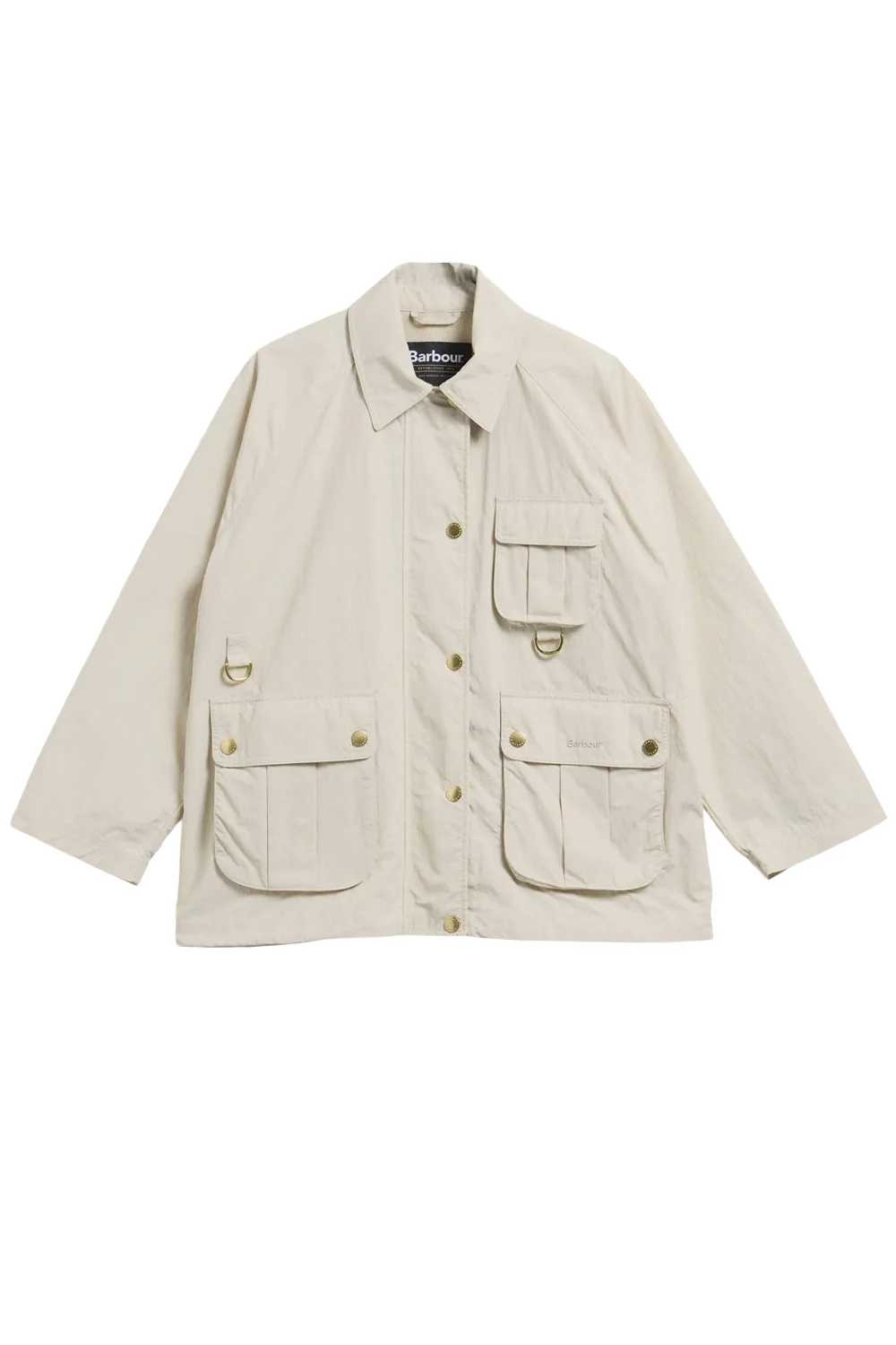 BARBOUR La giacca antipioggia Debbie di Barbour colore beige chiaro è un capospalla funzionale e di tendenza, perfetto per proteggerti anche dalle condizioni meteo più imprevedibili. Questa giacca oversize in stile blouson è sfoderata e presenta un finish impermeabile, inserti di ventilazione in mesh sul carré posteriore e un orlo regolabile per garantire un maggiore comfort. I dettagli che impreziosiscono questo capospalla includono una chiusura con bottoni a pressione e zip al di sotto, anelli a D, tasche a soffietto con piega a cannoncino e un particolare in tartan sotto il colletto. Rifinito dal logo Barbour sulla patta della tasca sinistra, è il mix perfetto di praticità e stile inconfondibile.