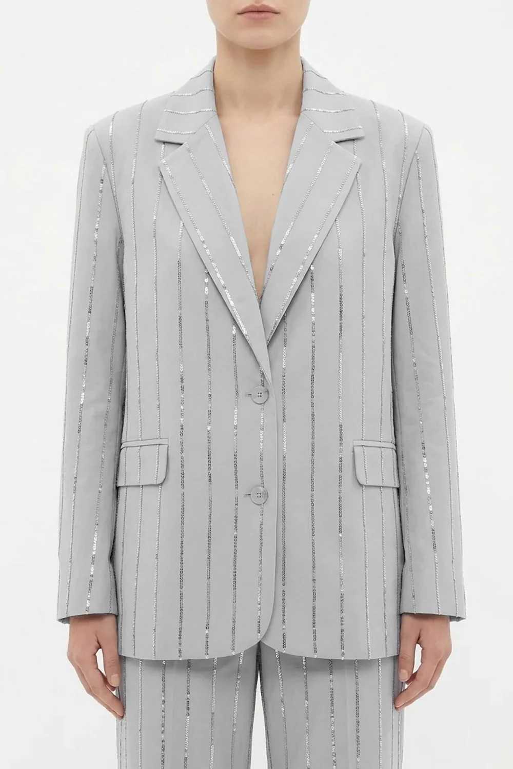 ISABELLE BLANCHE Blazer monopetto in cotone colore beige chardonnay con ricamo di pailettes a righe in argento COMPOSIZIONE: 100% COTONE FODERA 55% POLIESTERE 45% VISCOSA