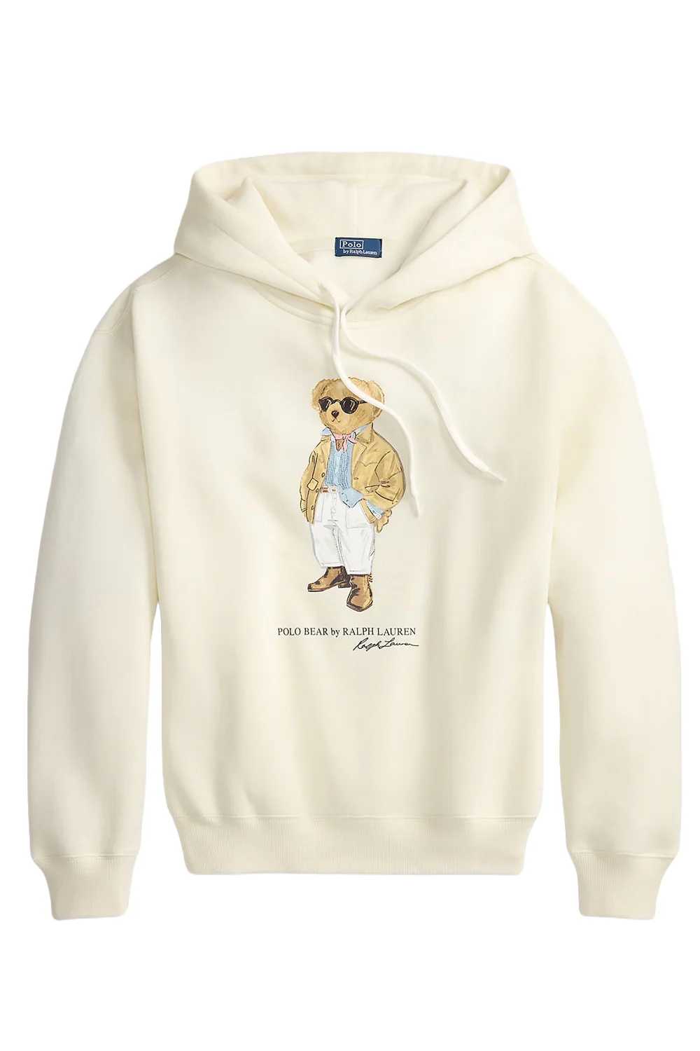 POLO RALPH LAUREN Felpa in cotone colore panna con cappuccio con coulisse e stampa frontale Polo Bear. Taglio morbido, lunghezza ai fianchi. Corpo e fodera di cappuccio: 83% cotone, 17% poliestere. Finitura: 100% cotone.